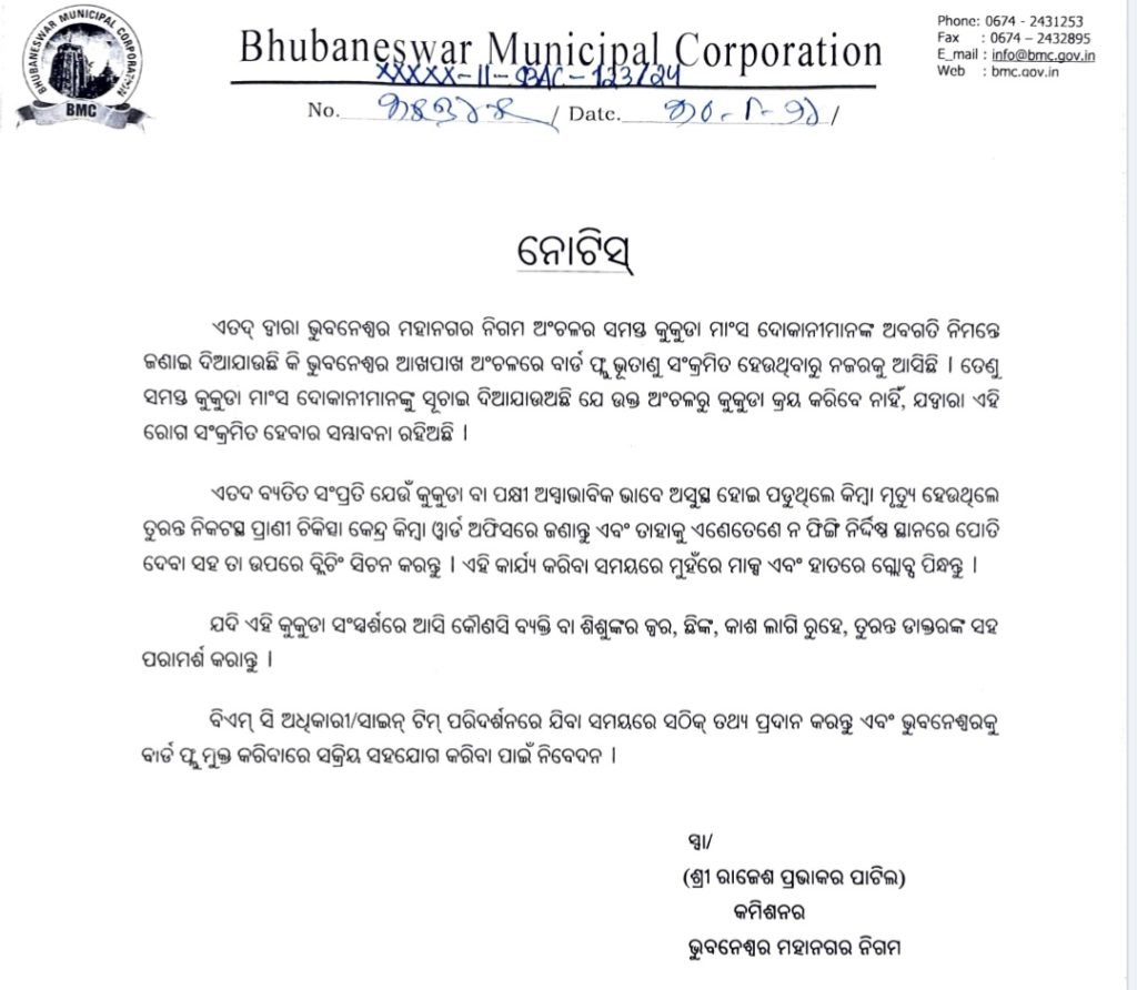 ଏଥିସହିତ ଭୁବନେଶ୍ୱର ଉପକଣ୍ଠରେ ବାର୍ଡ ଫ୍ଲୁ ବ୍ୟାପି ଥିବାରୁ ରାଜଧାନୀବାସୀ କିଛି ଦିନ ଚିକେନ ନ ଖାଇବାକୁ ଅନୁରୋଧ କରିଛନ୍ତି ଭୁବନେଶ୍ୱର ମେୟର ସୁଲୋଚନା ଦାସ। ସେ କହିଛନ୍ତି, ଭୁବନେଶ୍ୱରର ଆଖପାଖ ଅଞ୍ଚଳରେ ବାର୍ଡ ଫ୍ଲୁ ଭୂତାଣୁ ସଂକ୍ରମଣ ଦେଖାଦେଇଛି। ଏଥିପାଇଁ ବିଏମିସି ପକ୍ଷରୁ ନିର୍ଦ୍ଦେଶନାମା ଜାରି କରାଯାଇଛି। କୁକୁଡ଼ା ବ୍ୟବସାୟୀଙ୍କୁ ବାହାରୁ କୁକୁଡ଼ା ନ ଆଣିବାକୁ ନିର୍ଦ୍ଦେଶ ଦେଇଛୁ।