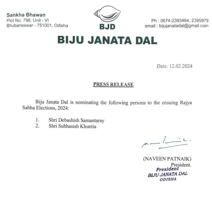 ଭୁବନେଶ୍ଵର, ୧୨/୨ (ସତ୍ୟପାଠ ବ୍ୟୁରୋ): ଆଜି ରାଜ୍ୟସଭା ଲାଗି ପ୍ରାର୍ଥୀ ଘୋଷଣା କରିଛି ବିଜେଡ଼ି। ୨ ରାଜ୍ୟସଭା ପ୍ରାର୍ଥୀଙ୍କ ନାମ ଘୋଷଣା କରିଛି ବିଜେଡ଼ି। ଦେବାଶିଷ ସାମନ୍ତରାୟ ଓ ଶୁଭାଶିଷ ଖୁଣ୍ଟିଆ ବିଜେଡ଼ିର ରାଜ୍ୟସଭା ପ୍ରାର୍ଥୀ ହୋଇଛନ୍ତି। ବାରବାଟୀ- କଟକର ପୂର୍ବତନ ବିଧାୟକ ହେଉଛନ୍ତି ଦେବାଶିଷ। ସେହପରି ବର୍ତ୍ତମାନ ଯୁବ ବିଜେଡିର ଉପସଭାପତି ଦାୟିତ୍ବରେ ଅଛନ୍ତି ଶୁଭାଶିଷ ଖୁଣ୍ଟିଆ । ତେବେ ଓଡ଼ିଶାରୁ ୩ଟି ରାଜ୍ୟସଭା ଆସନ ଖାଲି ହୋଇଥିବା ବେଳେ ବିଜେଡି ୨ଟି ଆସନ ପାଇଁ ପ୍ରାର୍ଥୀ ଘୋଷଣା କରିଛି।