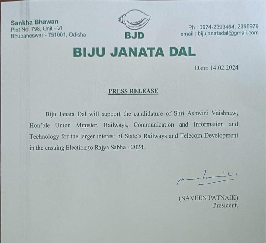 ଭୁବନେଶ୍ୱର,୧୪/୨(ସତ୍ୟପାଠ ବ୍ୟୁରୋ): ବିଜେପି ରାଜ୍ୟସଭା ପ୍ରାର୍ଥୀ ଅଶ୍ୱିନୀ ବୈଷ୍ଣବଙ୍କୁ ସମର୍ଥନ କଲା ବିଜେଡି । ପ୍ରେସ ବିଜ୍ଞପ୍ତି ଜରିଆରେ ସମର୍ଥନ ଘୋଷଣା କରିଛନ୍ତି ବିଜେଡି ସୁପ୍ରିମୋ ନବୀନ ପଟ୍ଟନାୟକ । ରାଜ୍ୟର ବୃହତ୍ତର ସ୍ୱାର୍ଥ ଦୃଷ୍ଟିରୁ ଅଶ୍ୱିନୀଙ୍କୁ ସମର୍ଥନ ଘୋଷଣା କରିଛି ବିଜେଡି । ରେଲୱେ ଓ ଟେଲିକମ କ୍ଷେତ୍ରରେ ରାଜ୍ୟର ସ୍ୱାର୍ଥକୁ ଦୃଷ୍ଟିରେ ରଖି ସମର୍ଥନ ଘୋଷଣା କରିଛି ବିଜେଡି ।