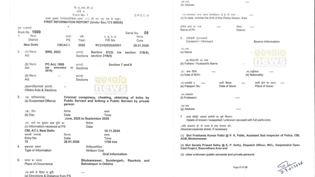 ‘ସତ୍ୟପାଠ ‘ ନିକଟରେ ଥିବା FIR କପି ଅନୁଯାୟୀ, CBIର ଭୁବନେଶ୍ୱର ଶାଖାରେ କାର୍ଯ୍ୟରତ ASI ପ୍ରଶାନ୍ତ କୁମାର ପଲ୍ଲେଇ ଏବଂ ମହାନଦୀ କୋଲଫିଲ୍ଡସ୍ ଲିମିଟେଡ୍ (MCL)ର ଡିସପାଚ୍ ଅଫିସର ସାରଦା ପ୍ରସାଦ ସେଠୀଙ୍କ ମଧ୍ୟରେ ଏକ ଭୟଙ୍କର ଅପରାଧିକ ସମ୍ପର୍କ ରହିଥିଲା। ସଂସ୍ଥାର ଅଭିଯୋଗ ଅନୁଯାୟୀ, ପଲ୍ଲେଇ ଦୁର୍ନୀତିର ତଦନ୍ତ କରିବା ପରିବର୍ତ୍ତେ ସେଠୀଙ୍କ ଉପରେ “ଟିକସ” ଲଗାଉଥିଲେ—ଅର୍ଥାତ୍ ତାଙ୍କୁ ଆଇନଗତ କାର୍ଯ୍ୟାନୁଷ୍ଠାନରୁ ସୁରକ୍ଷା ଦେଉଥିଲେ। ଅନ୍ୟପଟେ ସେଠୀ ଗର୍ଜନବାହାଲ ଓପନ୍ କାଷ୍ଟ ପ୍ରୋଜେକ୍ଟରେ ଘରୋଇ ପରିବହନକାରୀଙ୍କ ପାଇଁ କୋଇଲା ଗ୍ରେଡ୍ ଏବଂ ଲୋଡିଂରେ ହେରଫେର କରୁଥିଲେ।