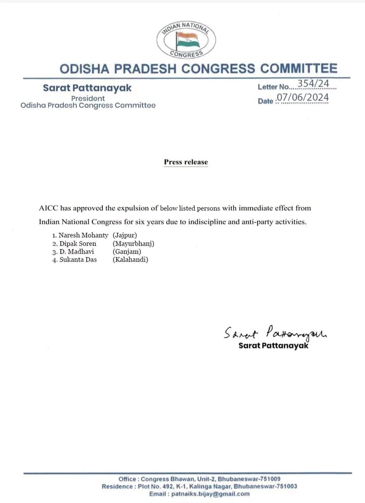 ତେବେ ଏଥିରେ ଉଲ୍ଲେଖ କରାଯାଇଛି ଯେ ଦଳବିରୋଧି ଏବଂ ଦଳଗତ ବିଶୃଙ୍ଖଳା ପାଇଁ ଏଭଳି ପଦକ୍ଷେପ ଗ୍ରହଣ କରାଯାଇଛି। ତେବେ ସେହି ୪ ନେତା ହେଉଛନ୍ତି, ଯାଜପୁରର ନରେଶ ମହାନ୍ତି, ମୟୂରଭଞ୍ଜର ଦୀପକ ସୋରେନ, ଗଞ୍ଜାମର ଡି.ମାଧବୀ ଏବଂ କଳାହାଣ୍ଡିର ସୁକାନ୍ତ ଦାସ । ଏମାନଙ୍କୁ ଦଳରୁ ୬ ବର୍ଷ ପାଇଁ ବହିଷ୍କାର କରାଯାଇଛି।